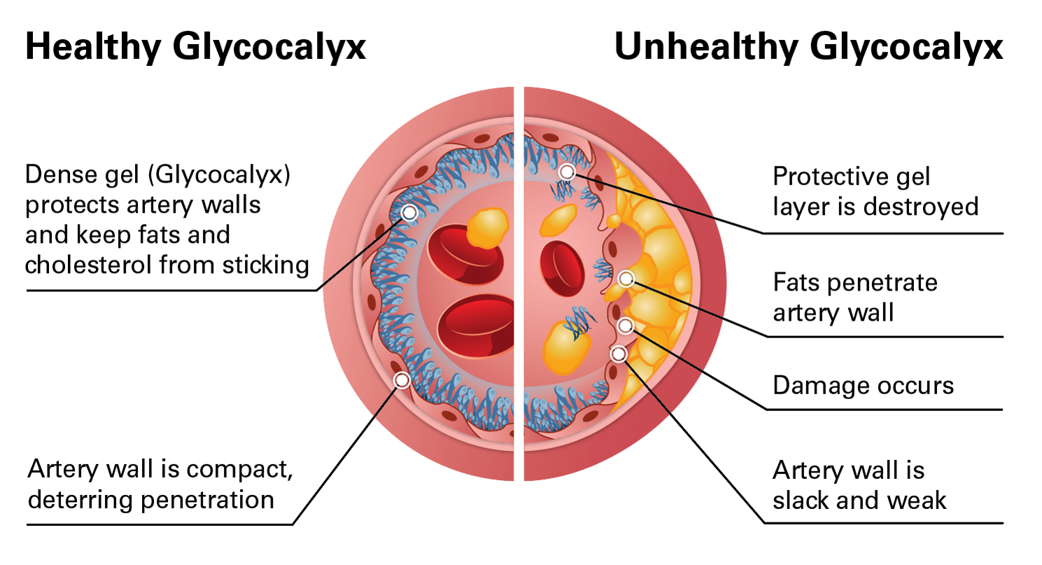 When glycocalyx function becomes compromised due to aging, poor diet, lack of exercise, genetics, stress, and other factors, it can become leaky. And when that happens, diseases and conditions can silently begin. Organs begin to starve without vital nutrient delivery, leading tov health decline.